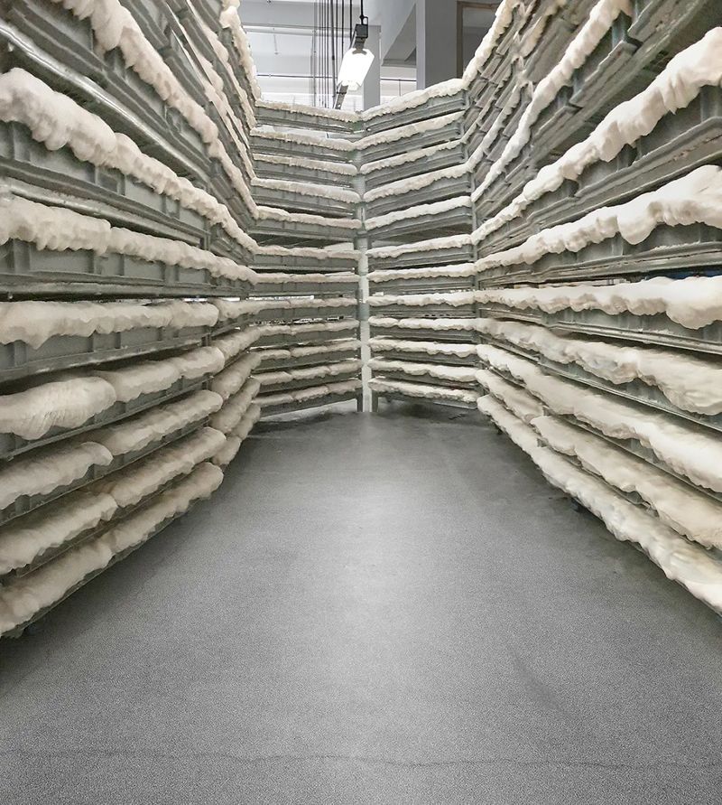 The process begins with mycelium cells grown on a bed of renewable, organic substrate inside our vertical farming facility that is powered by 100% renewable electricity.