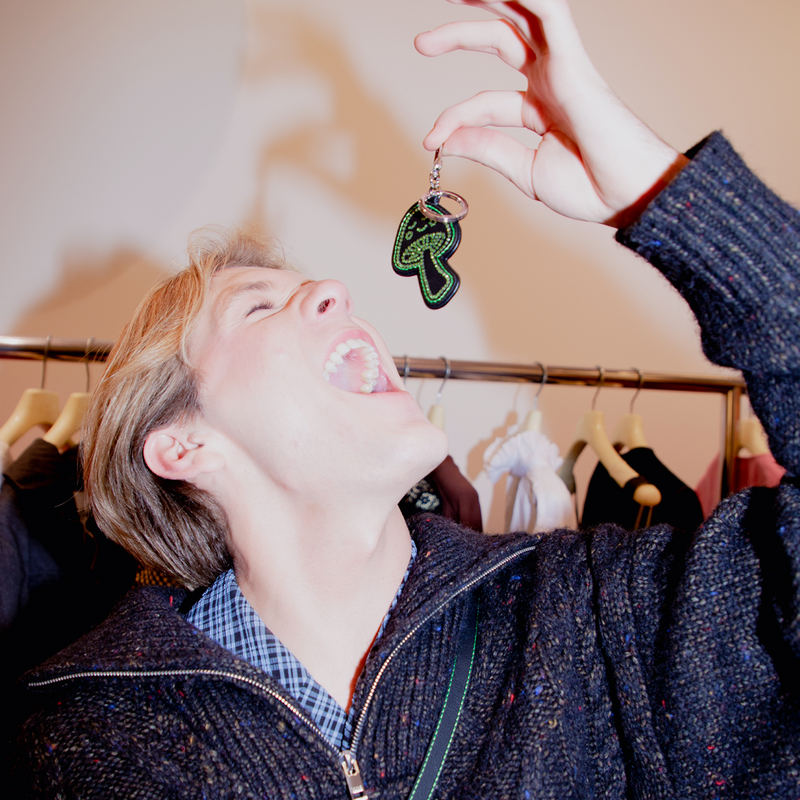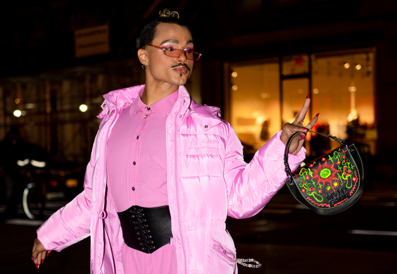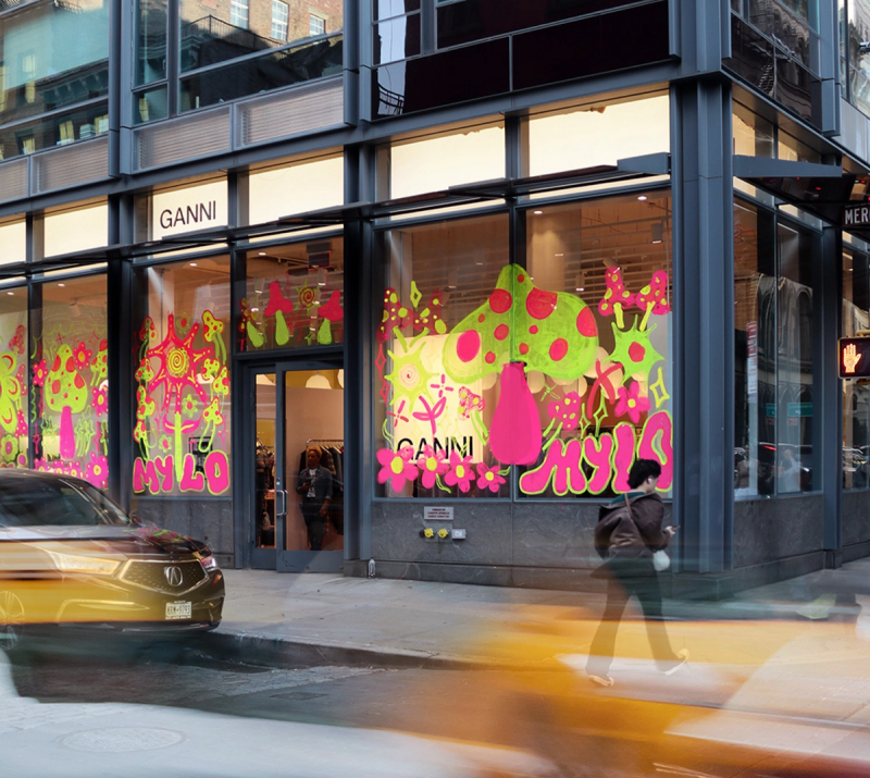 Guests were the first to lay their hands on this special collection of classic GANNI styles reimagined in Mylo, our soft, supple mycelium-based material. The fresh assortment of saddlebags, wallets, and keychains were nestled in a dazzling display brimming with real mushrooms designed by FDK Florals, while the vibrant storefront windows were hand-painted by GANNI designer Lukas Højlund — whose handy work could also be seen on a select number of GANNI x Mylo bags. GANNI plans to release more Mylo products in 2023.