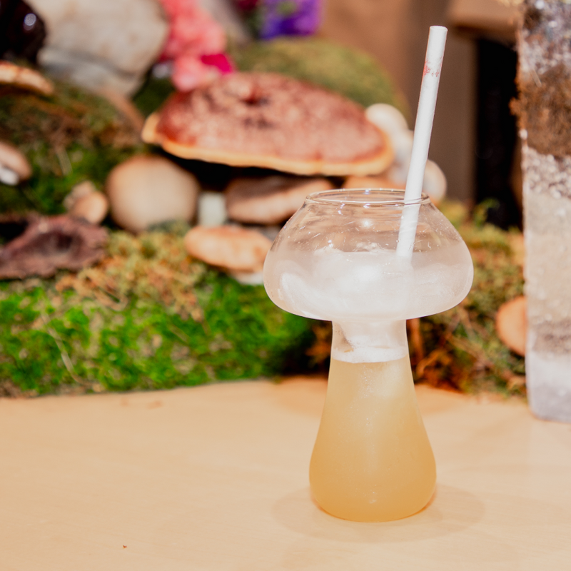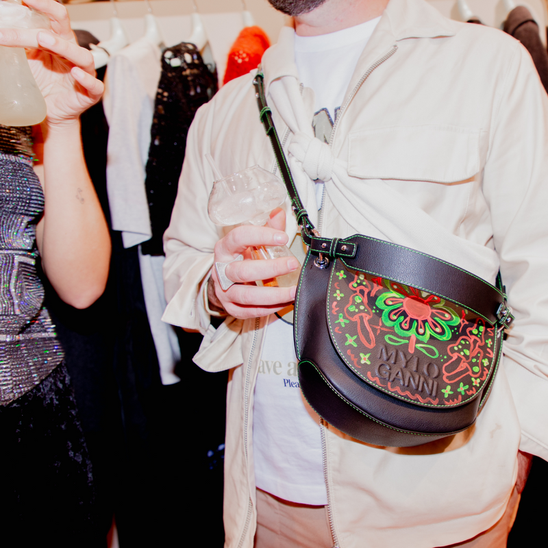 As usual, GANNI’s unapologetically cool style was on full display. #GANNIGirls and mushroom enthusiasts alike gathered to get a first look and join us in toasting to the future of fashion made from fungi. Guests included Tomás Matos, Griffin Maxwell Brooks, Jazmine Rogers, and Davis Burleson. Representing our beloved brand partner was Louise du Toit, President North America at GANNI, rocking a hand-painted Mylo saddlebag — a centerpiece of the night.