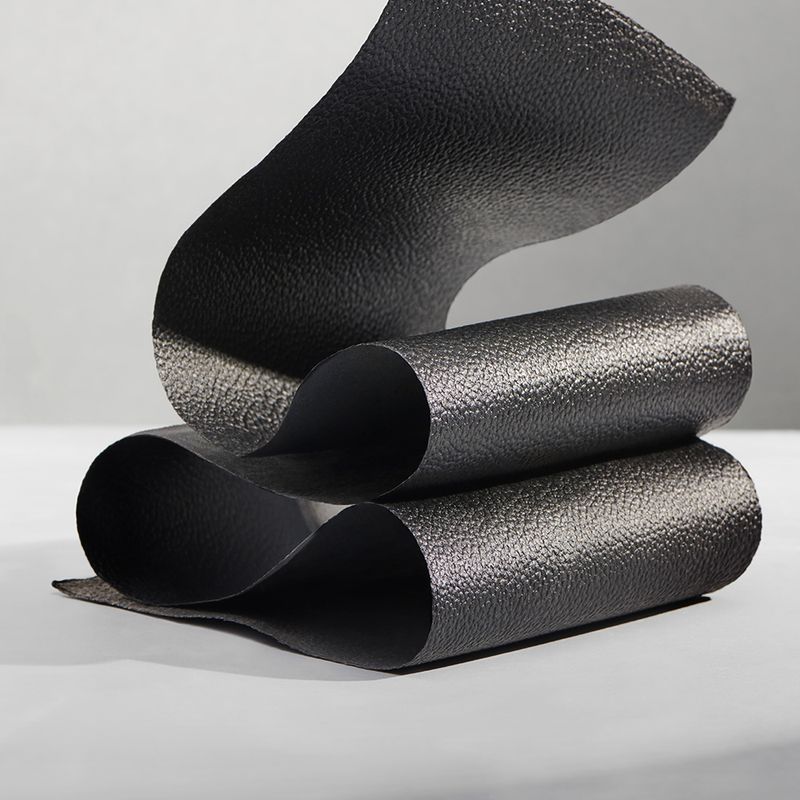 The skins are dried and then ground into powder, where they are mixed with pigments. The powder is mixed with PU, the binding agent of this leather alternative, and spread on a canvas to dry.