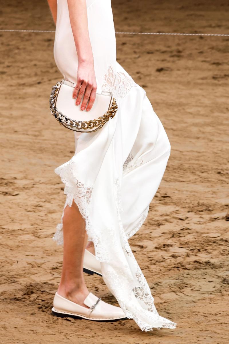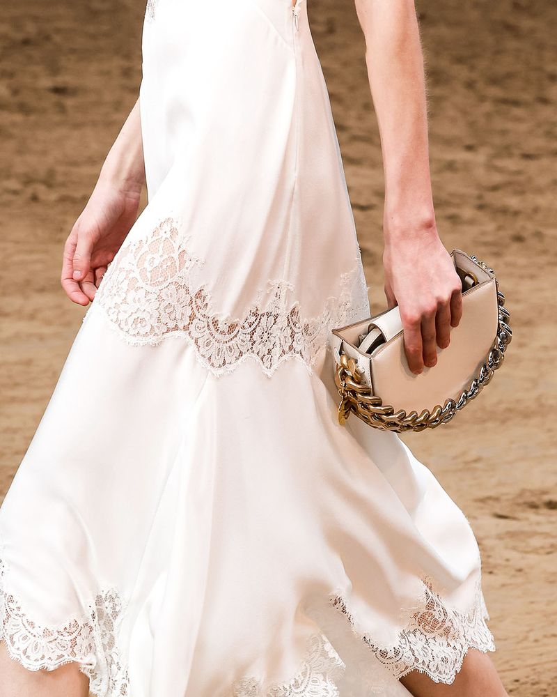 The newest evolution of the Frayme Mylo™ was thoughtfully paired with one of the collection’s softer looks worn by model Felice Nova Noordhoff. A flowing asymmetrical white slip dress with lace cutouts was in stunning contrast to the Frayme Mylo™'s oversized aluminum chain strap and structured mycelium-based panels.